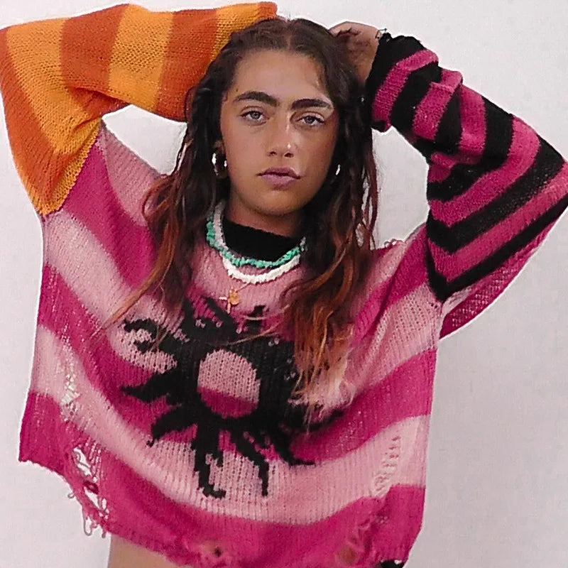 Fashion Women Striped Knitted Sweater Tops Cashmere Knit Loose Sweaters Vintage Y2K Lady Printed Ripped Hole Pullovers Harajuku