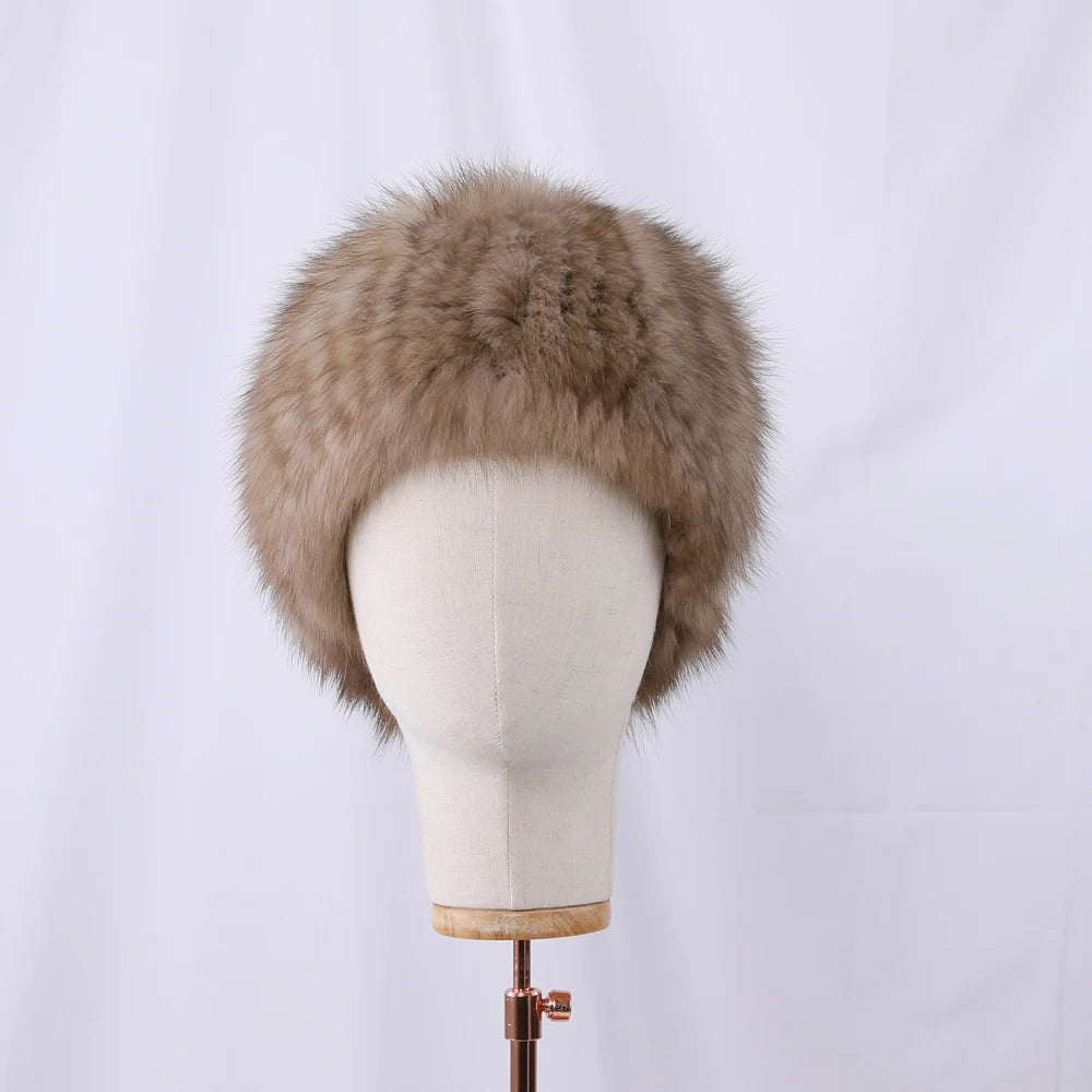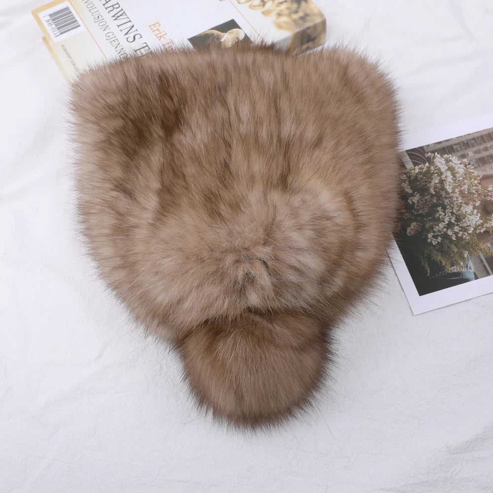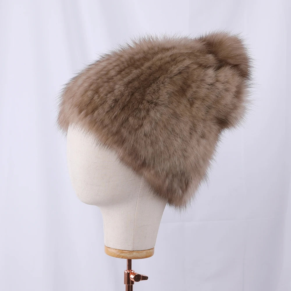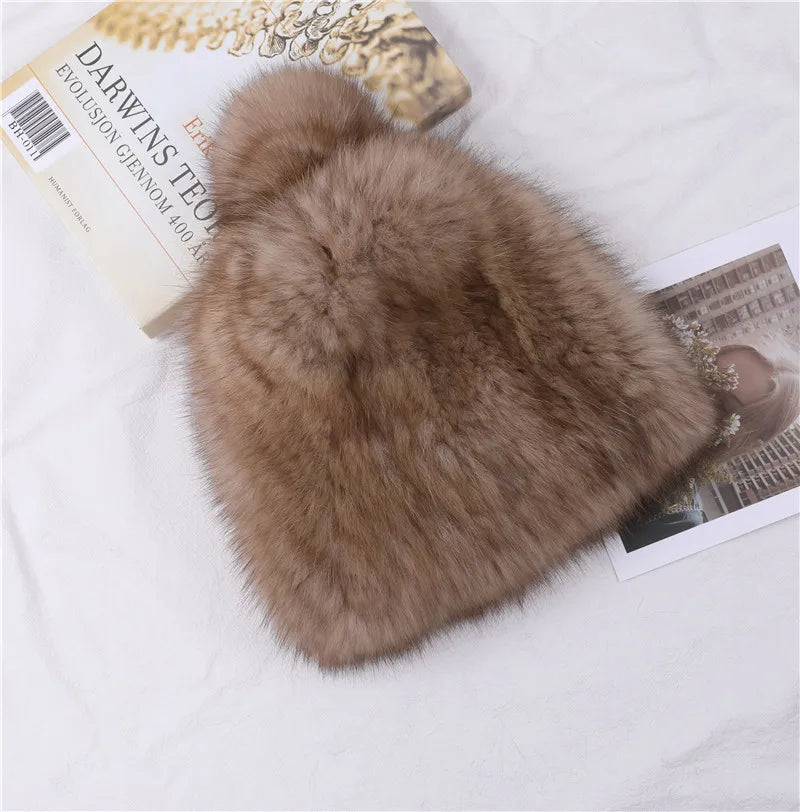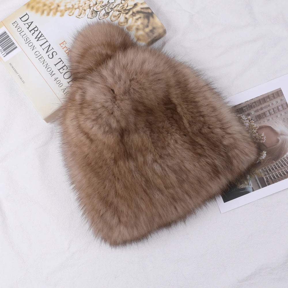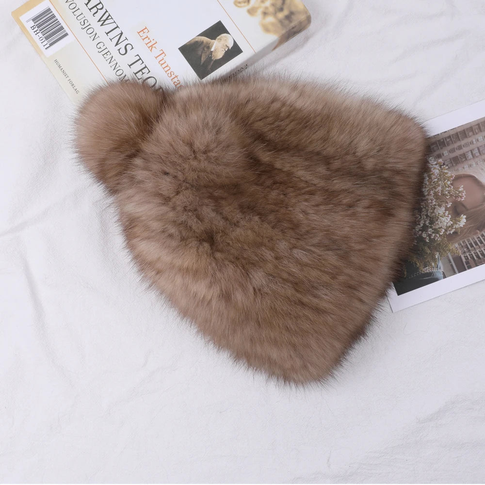 Luxyru Women's Winter Knitted 100% Real Sable Fur hat Fur Beanie Russian Mink Fur Cap With Fox Fur Pom Poms Female Warm Thick